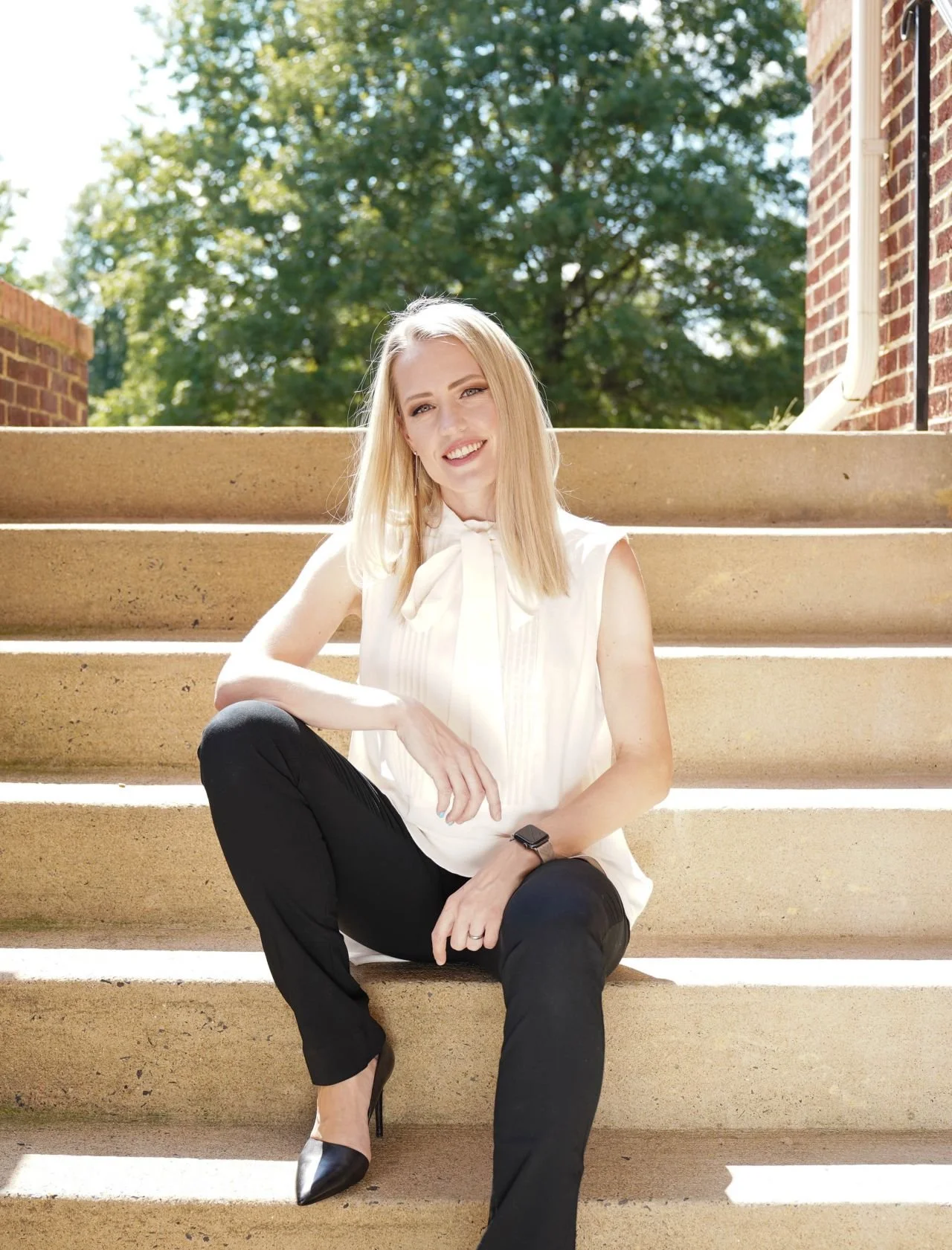Woman sitting on outdoor steps, wearing a white sleeveless top and black pants, with natural daylight and trees in the background.